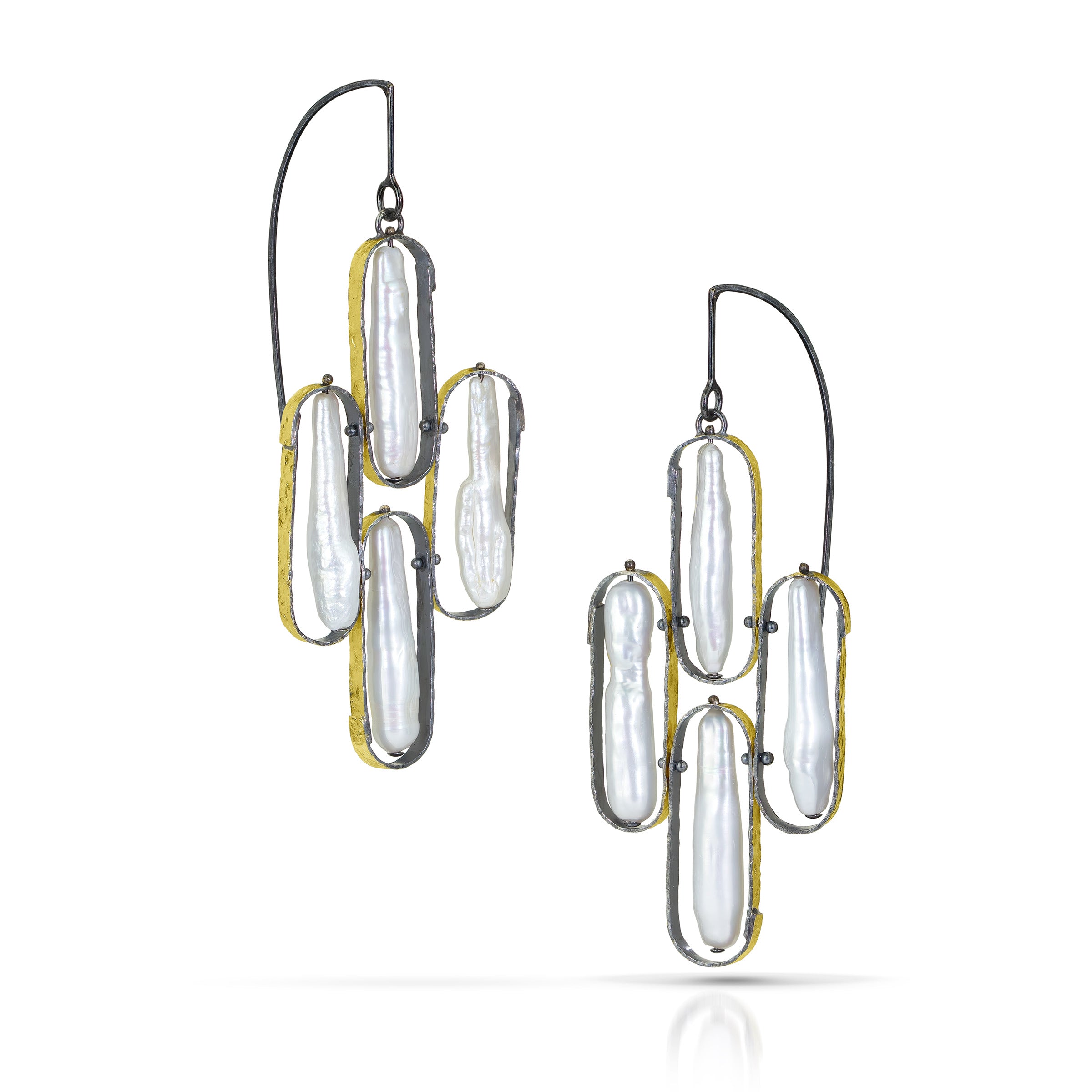 Like modernist chandeliers for your ears, these striking earrings are designed and hand-fabricated with movement in mind. Bands of 22k and oxidized sterling silver bimetal with a hand-hammered texture are riveted together and frame slender, luminous biwa pearls. The bands and pearls swing gently from sculptural ear wires and the earrings measure 2.88"L x 1.13"W.