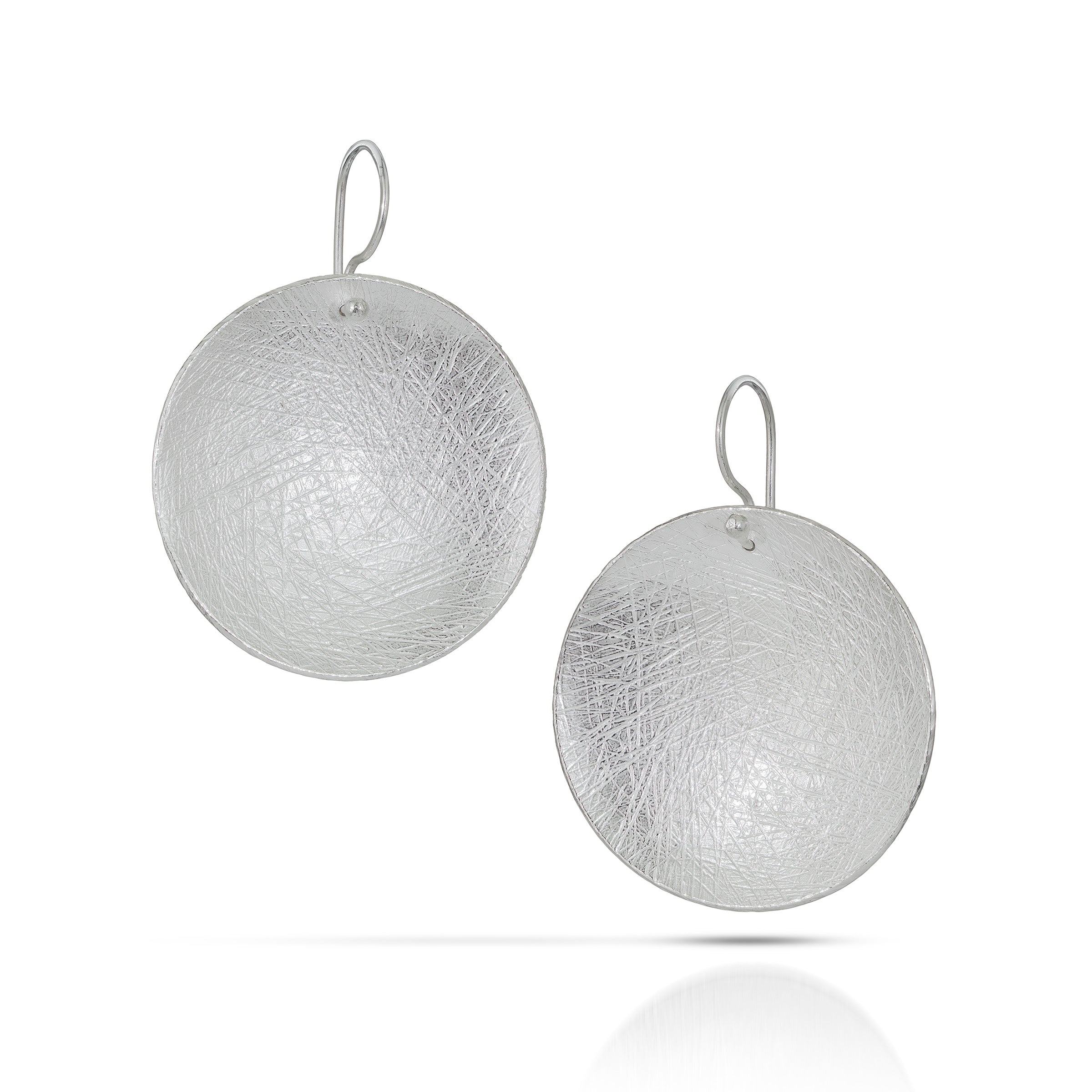 Suspended from hand formed 18k gold ear wires, concave disks in oxidized sterling silver are accented with our signature carved texture. The epitome of elegant simplicity these earrings are available in two sizes, the large pair measuring 1.5"DIA, and the small measure 1" DIA.