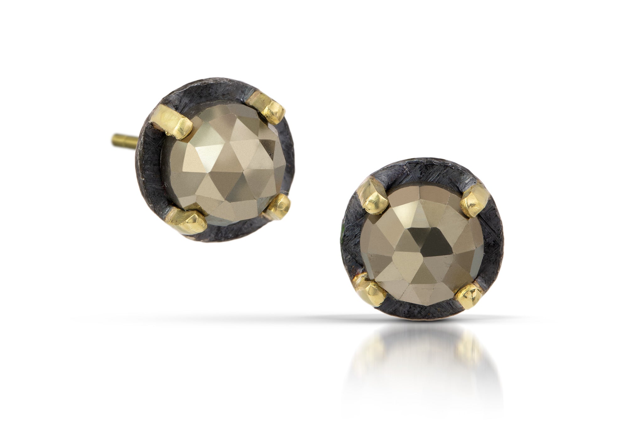 A long time customer favorite with a luxurious touch...four 18k yellow gold prongs pair with oxidized or bright sterling silver to hold luminous 6mm round rose cut stones that sparkle and shine in our signature settings. Accented with our carved texture, these earrings have 14k gold posts and measure .31"DIA.