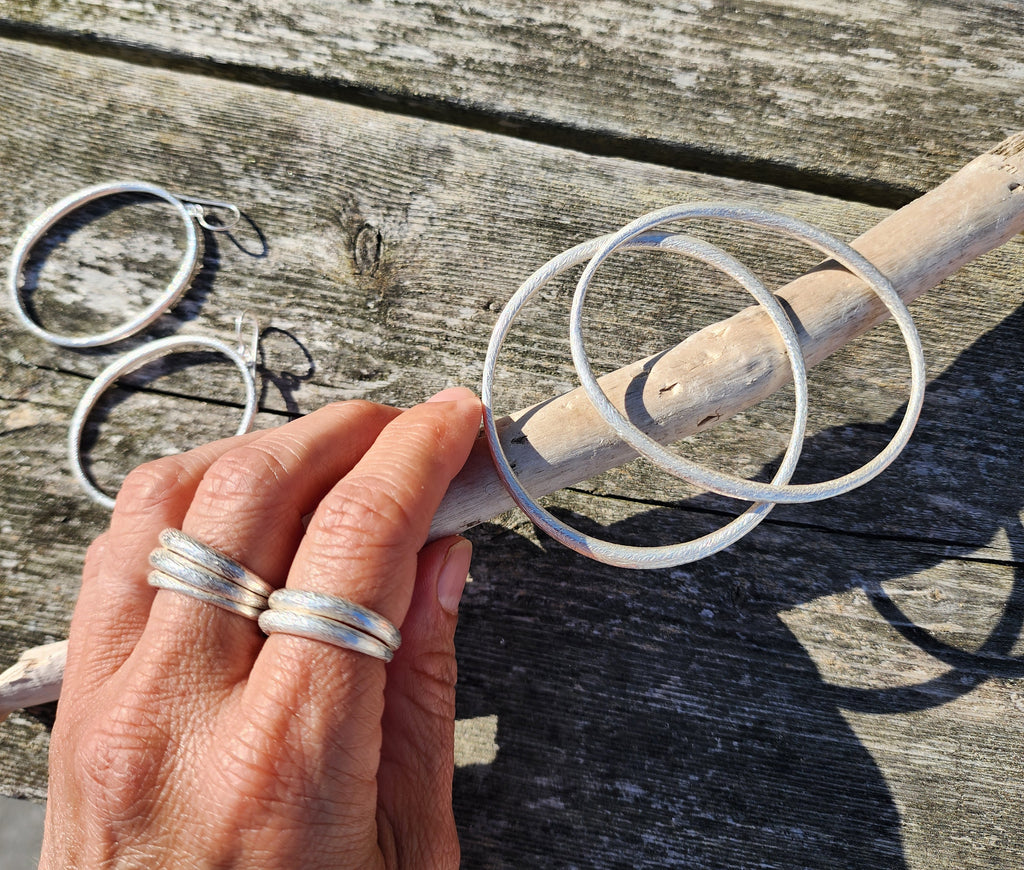 Organic, open ellipse shapes hang in perfect balance from a larger carved half circle. Each shape is textured with a variety of salvaged vintage files and oxidized to bring out the texture and line quality of the file marks and the earrings measure 2"L x 1"W.