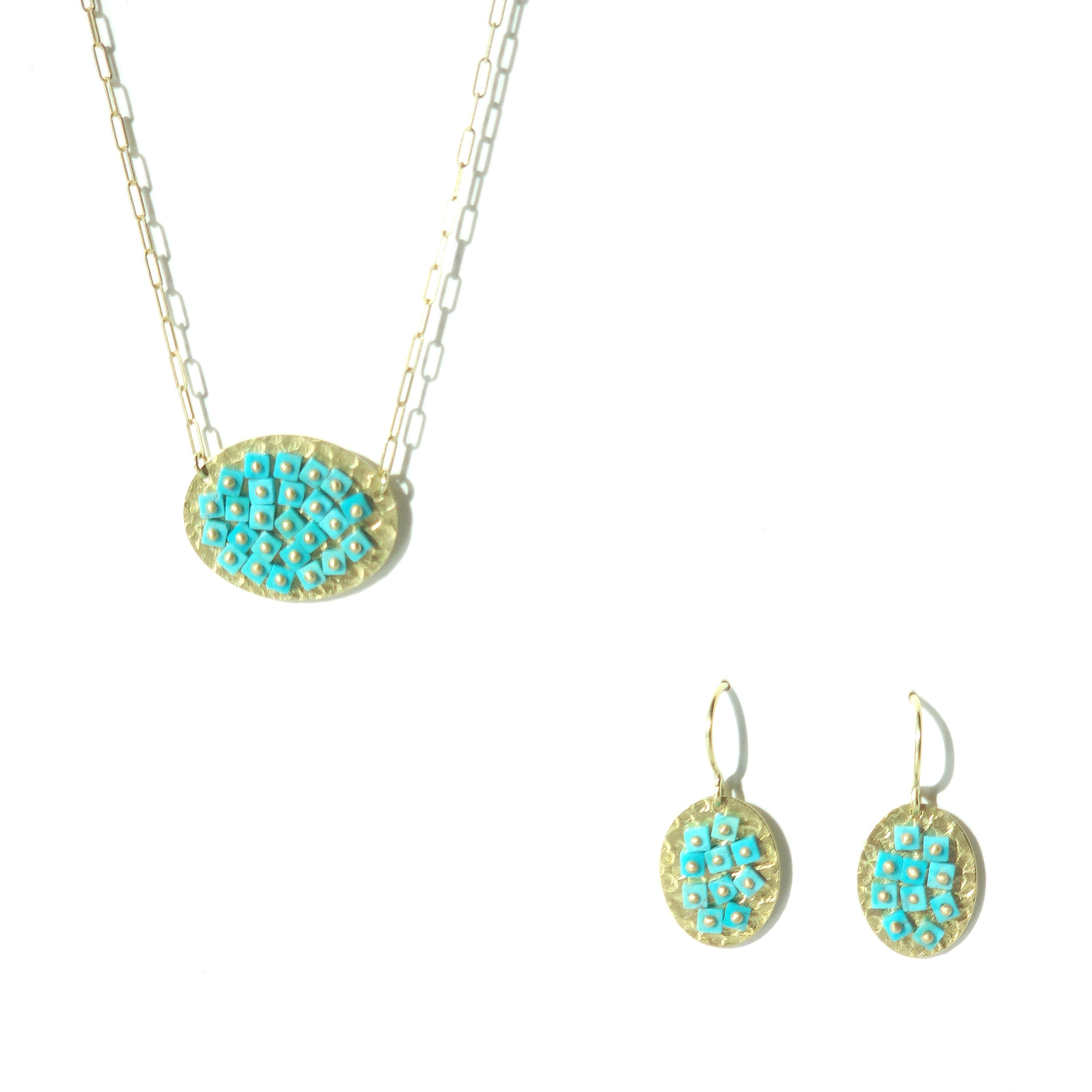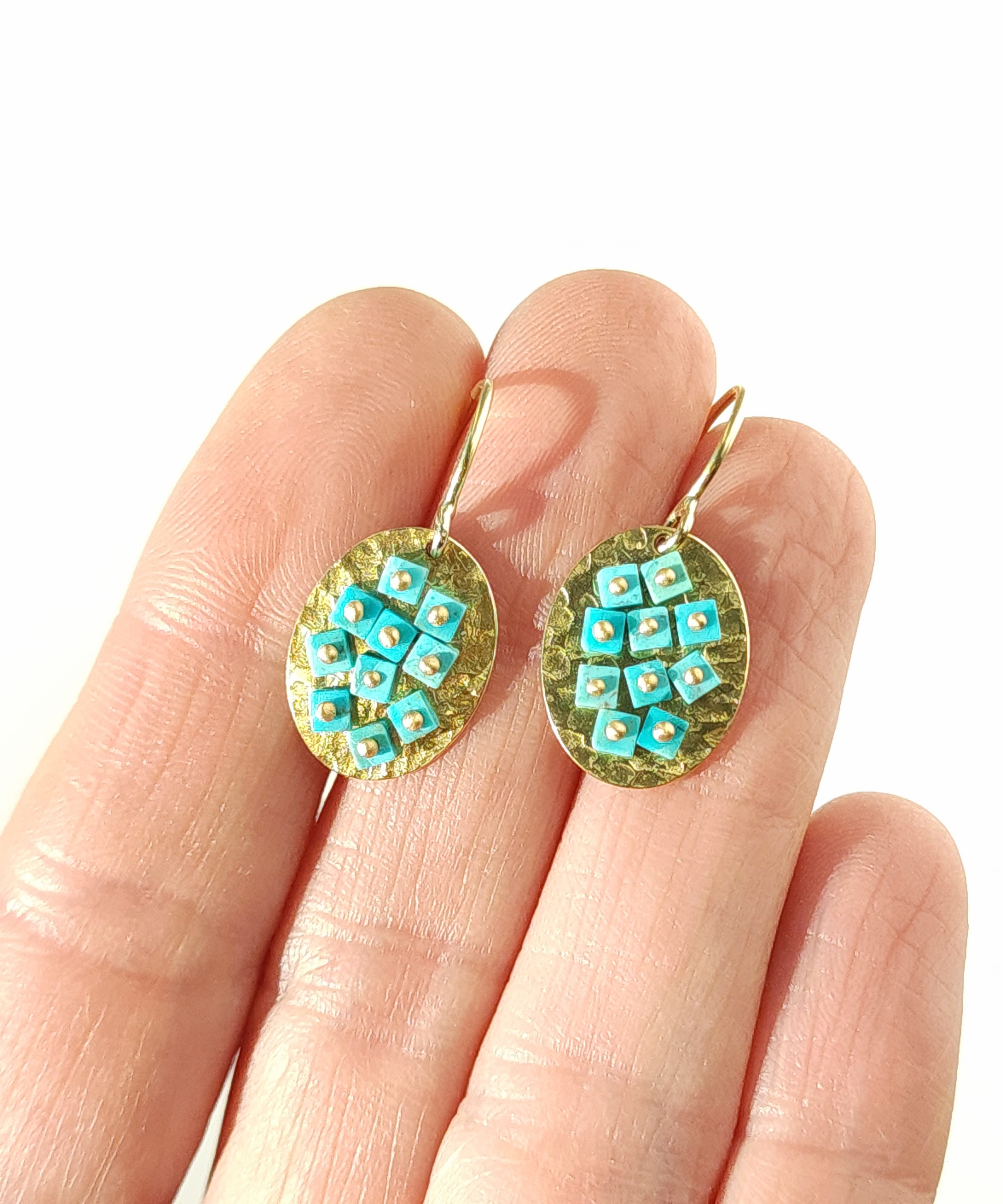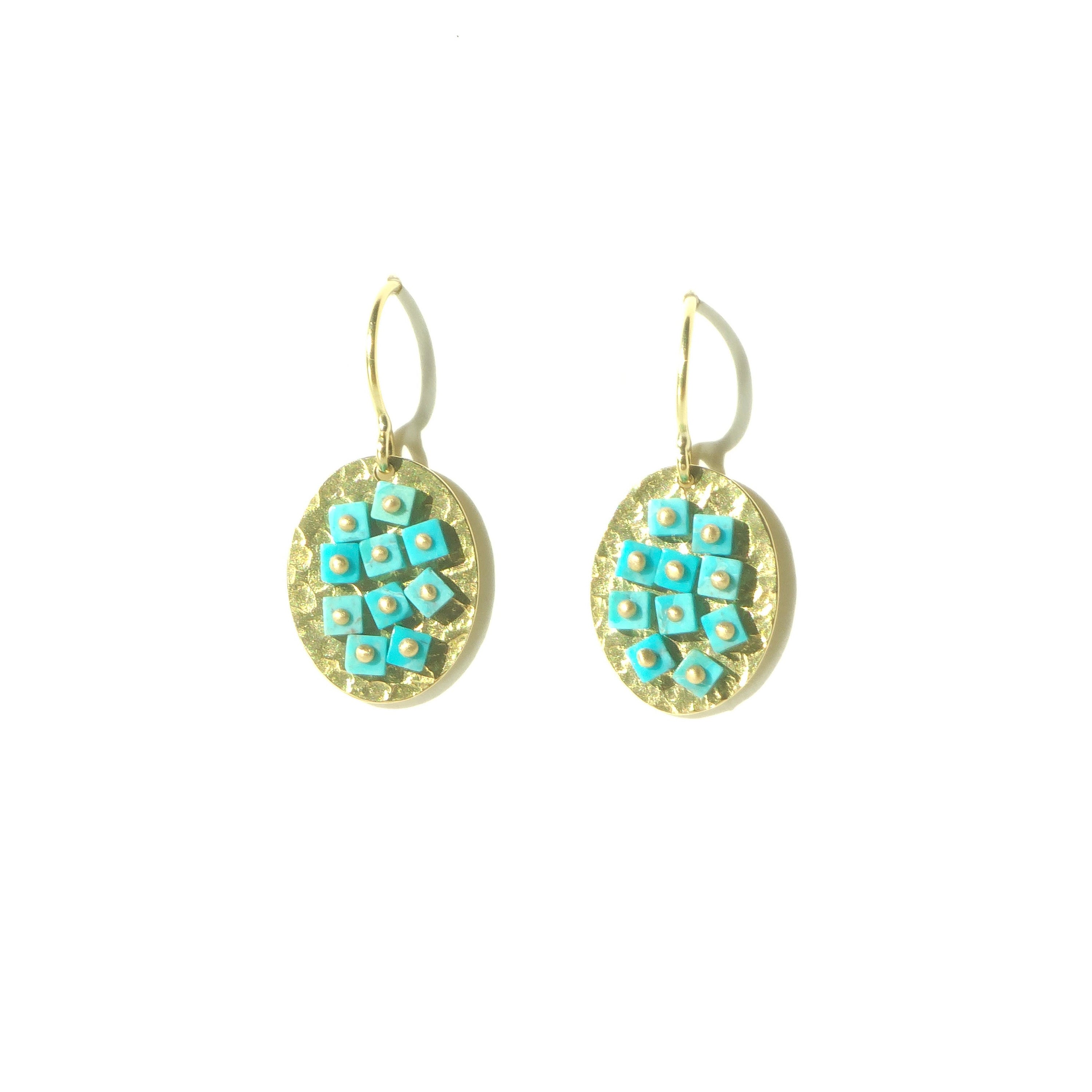 Hand-fabricated glowing 18k gold ovals with our signature hammered texture and matte finish feature square shaped slices of gorgeous robin's egg blue sleeping beauty turquoise that are individually riveted in place with our hand-fabricated 18k gold rivets. Suspended from our hand-formed 18k gold French style ear wires, the earrings measure 1.06"L x .5"W.