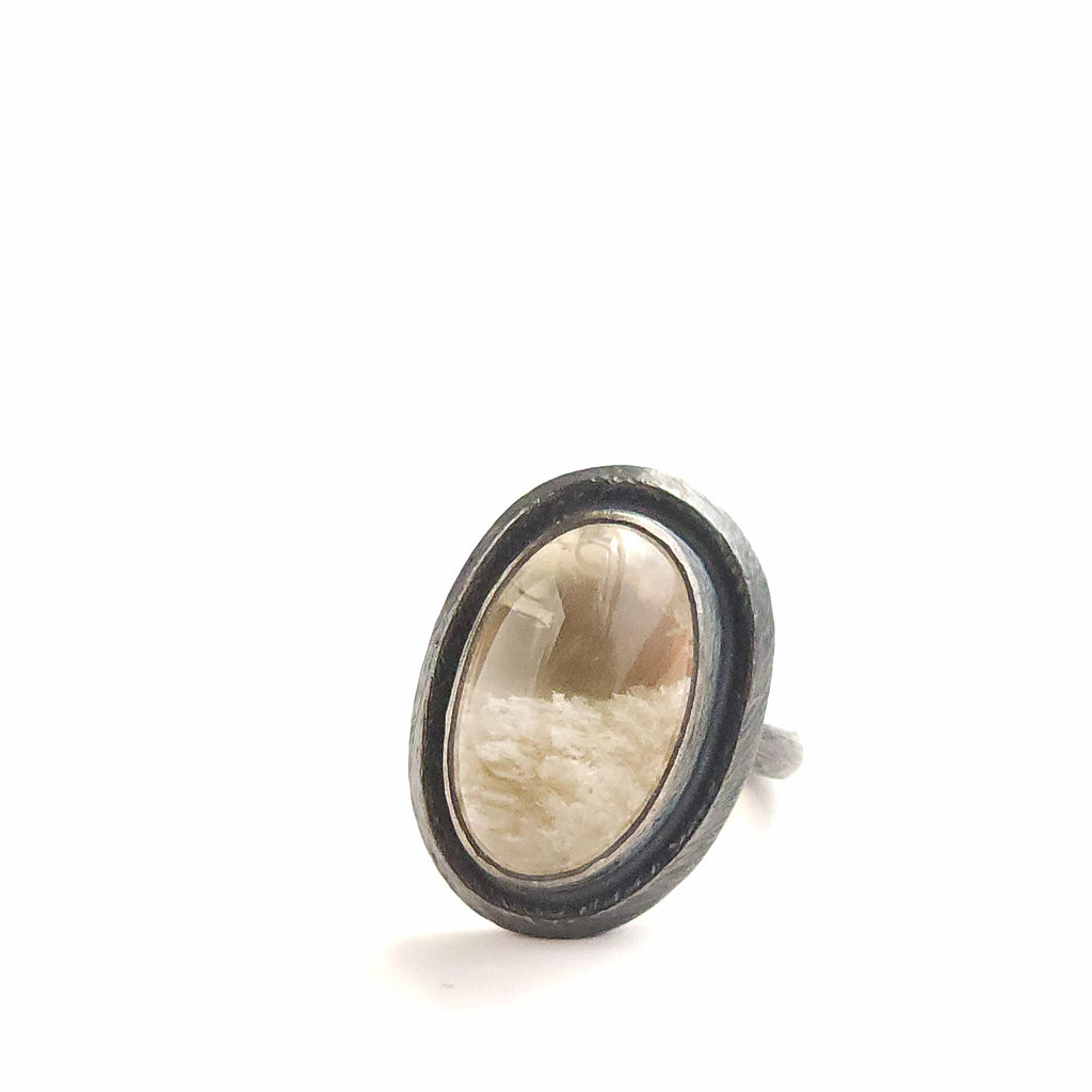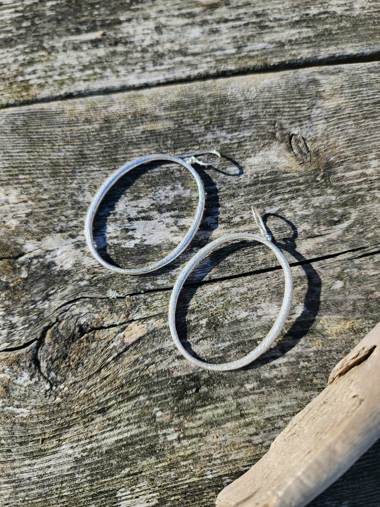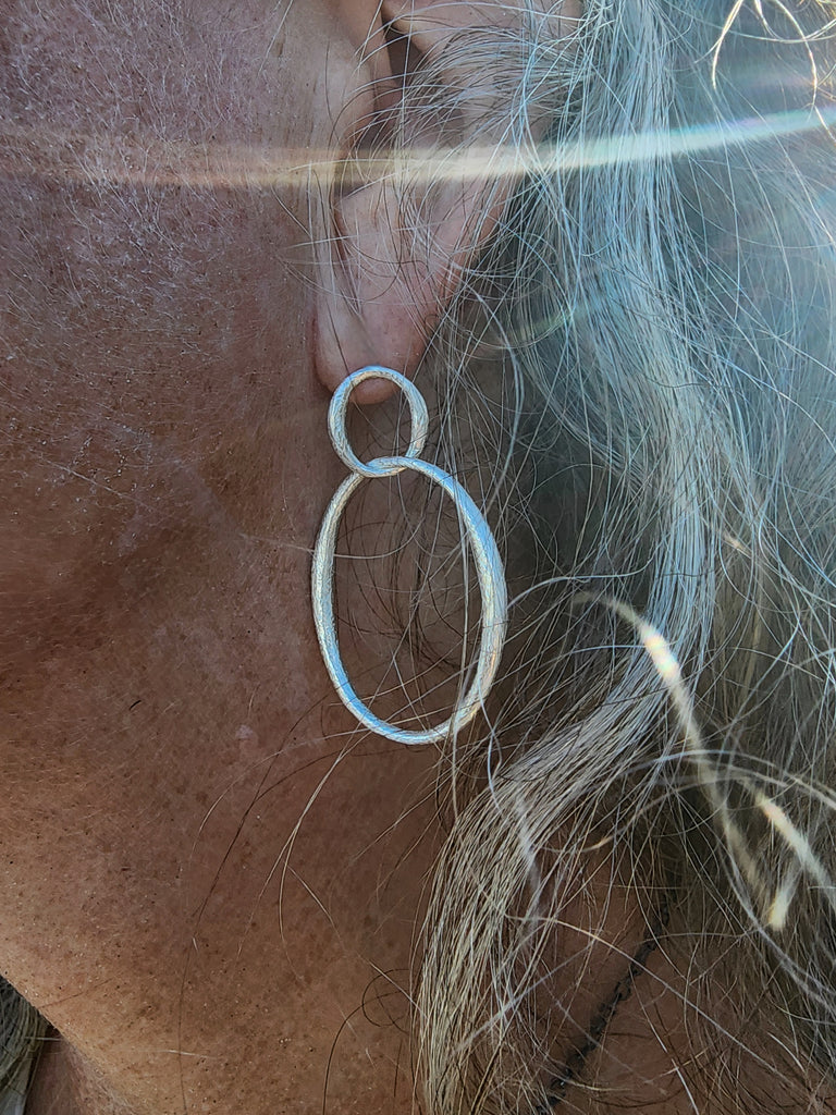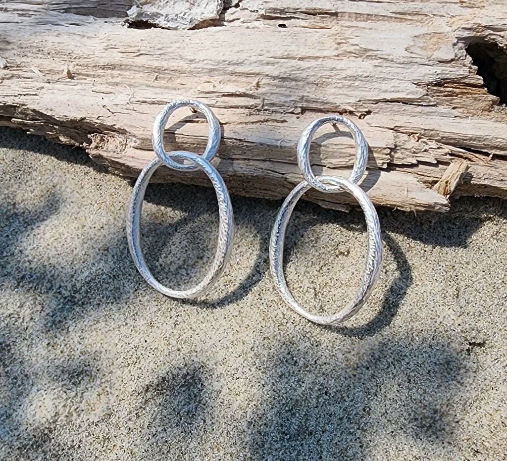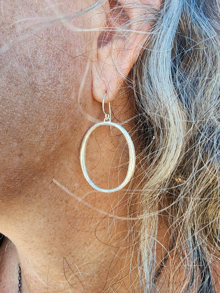 Oval-shaped earrings with textured surface and turquoise bead details on a white background