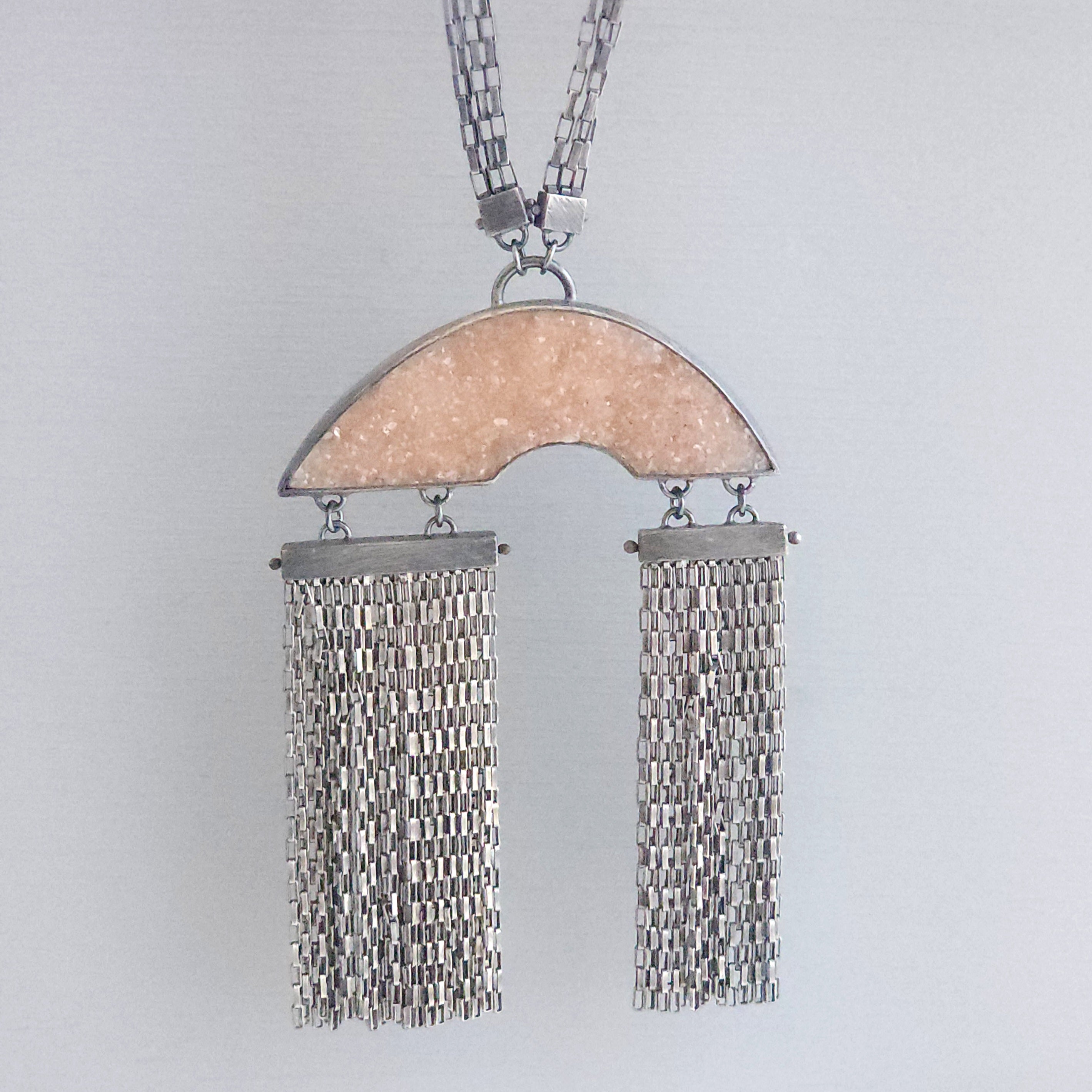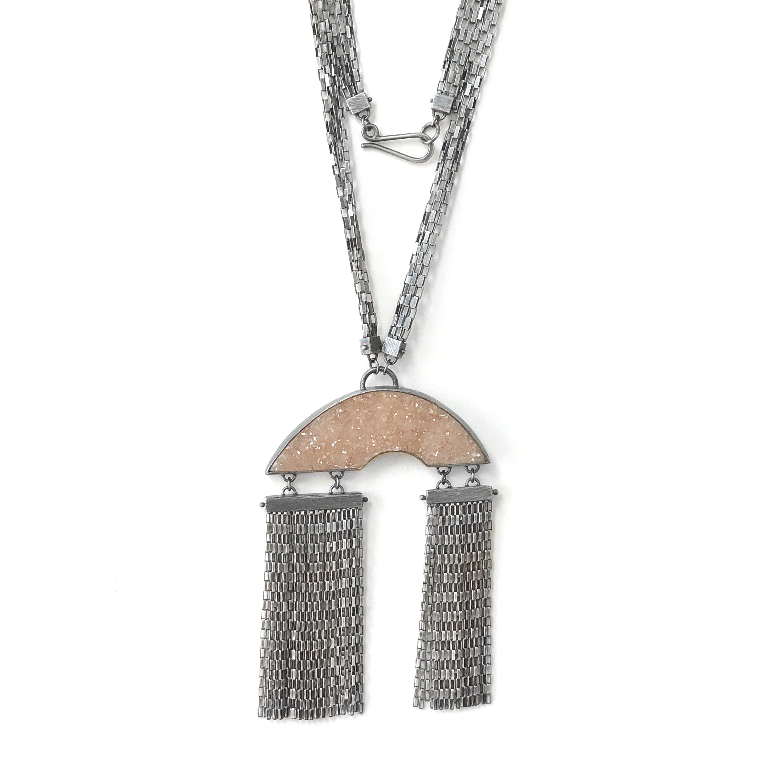 This jaw dropping architecturally shaped peachy pink druzy stone sports a special sparkle as the light hits the surface crystal formations. The asymmetrical double arch shaped stone has a custom hand-fabricated bezel setting and features two sections of our box chain fringe. The pendant is suspended from from a triple strand chain (a slightly scaled up version of the fringe box chain.) All in brushed oxidized sterling silver, the pendant measures 3.19"L x 2.125"W and the chain is 19.5"L, finished with a hand fabricated clasp.