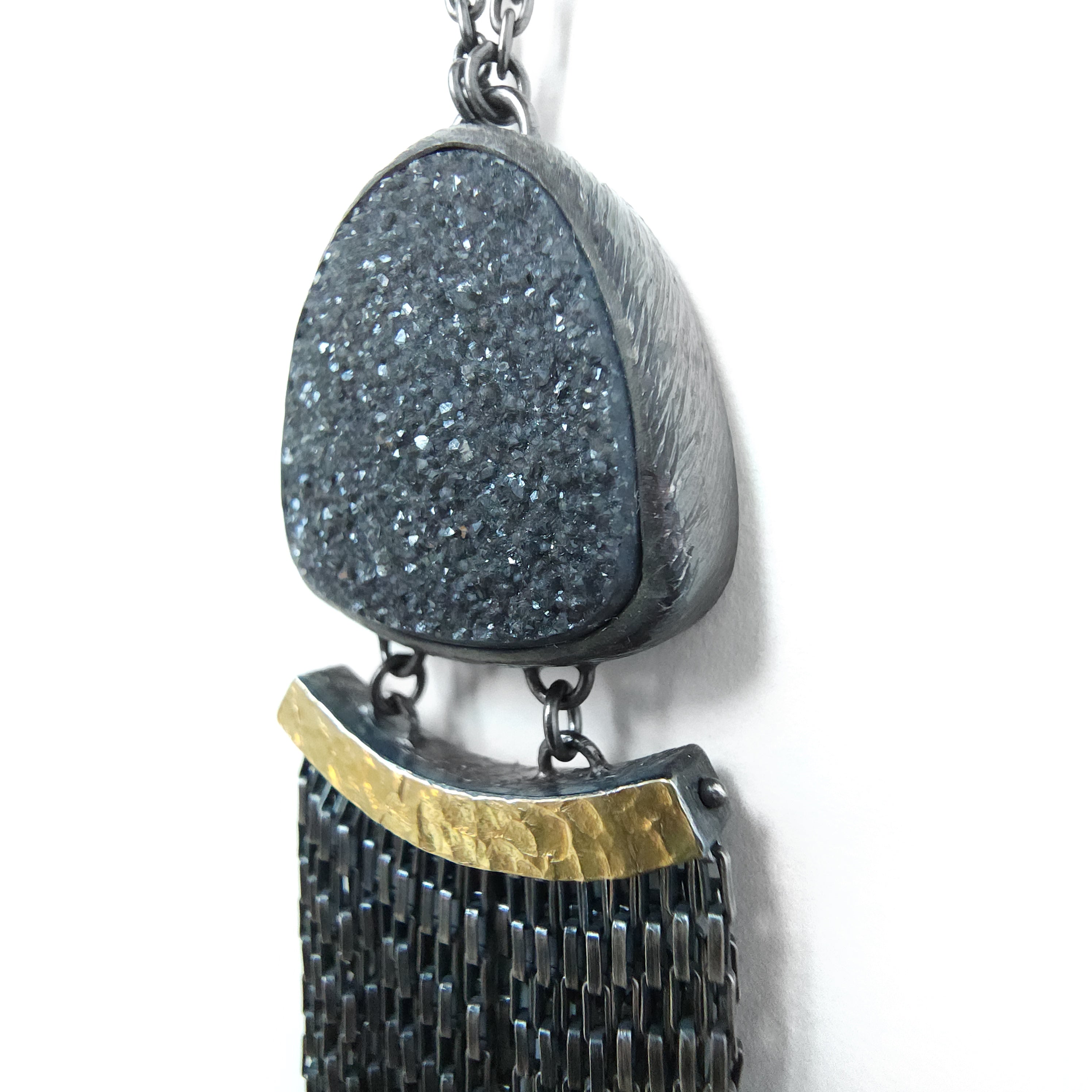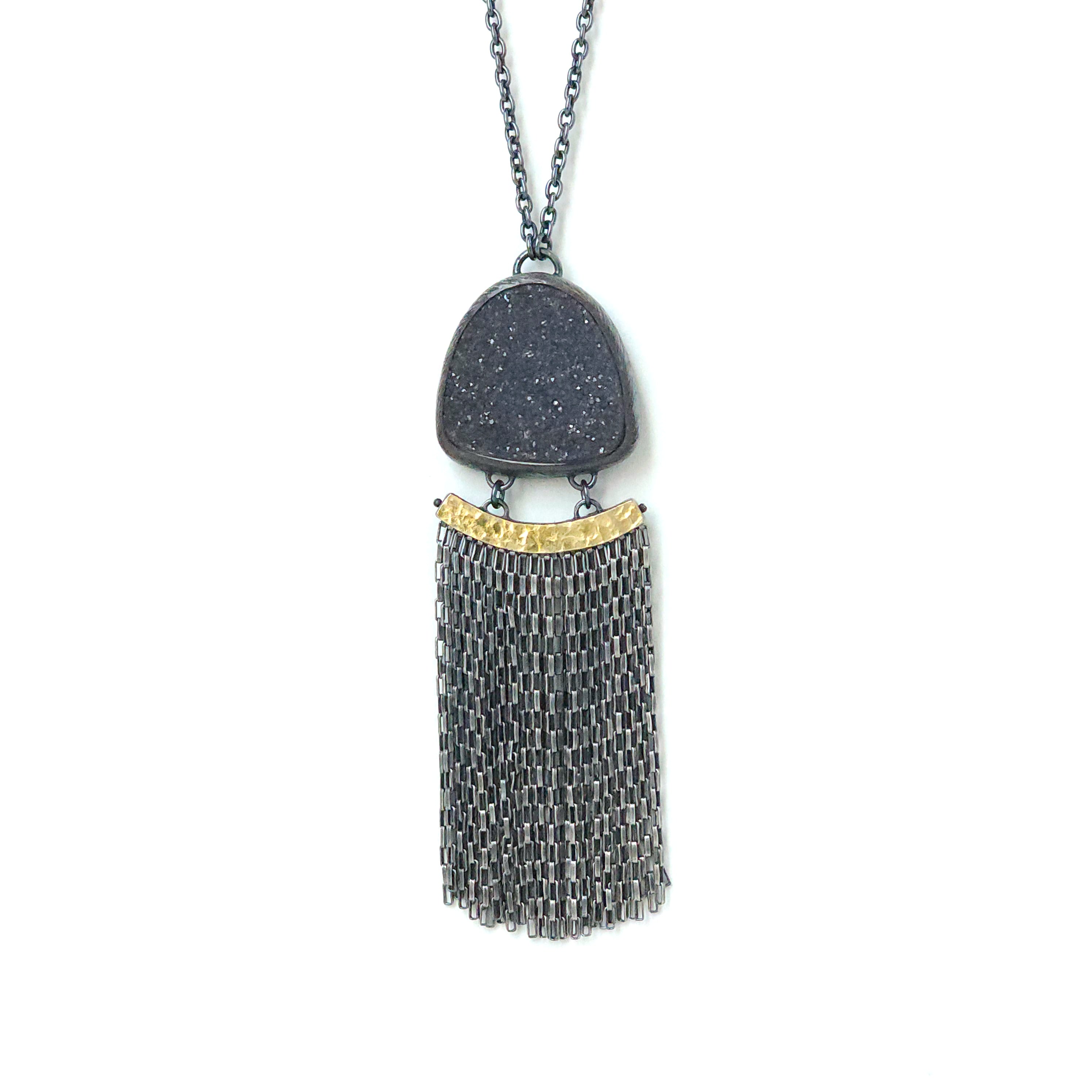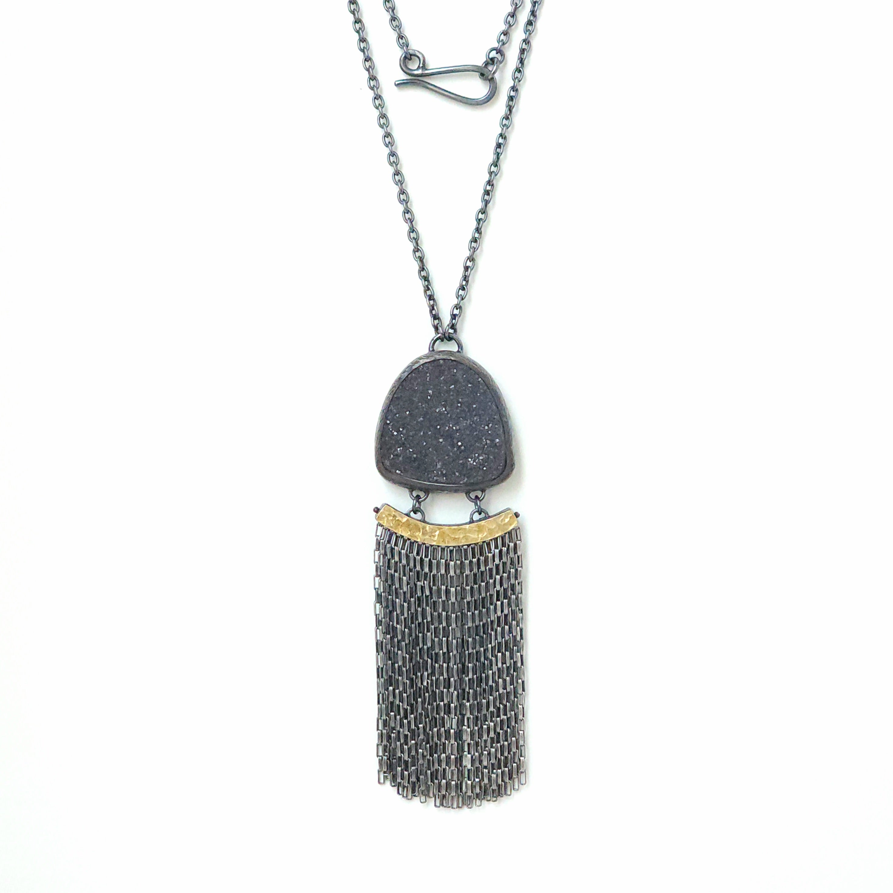 This sparkling black druzy stone appears almost sugar coated with its finely crystallized surface. Bezel set in deeply oxidized sterling silver accented with our signature carved texture, the stone sits above a row of oxidized sterling silver box chain fringe, swinging from a 22k gold bimetal bar setting with a hand-hammered finish. The pendant measures 5.31"L x 1"W and is suspended from a 17.5" chain finished with a hand fabricated hook & loop clasp.