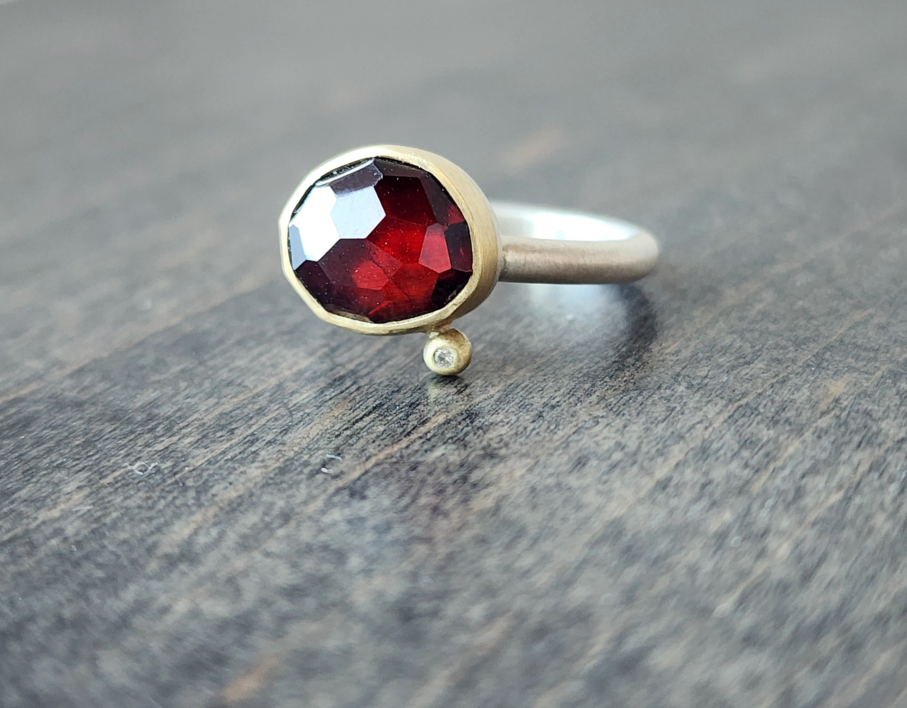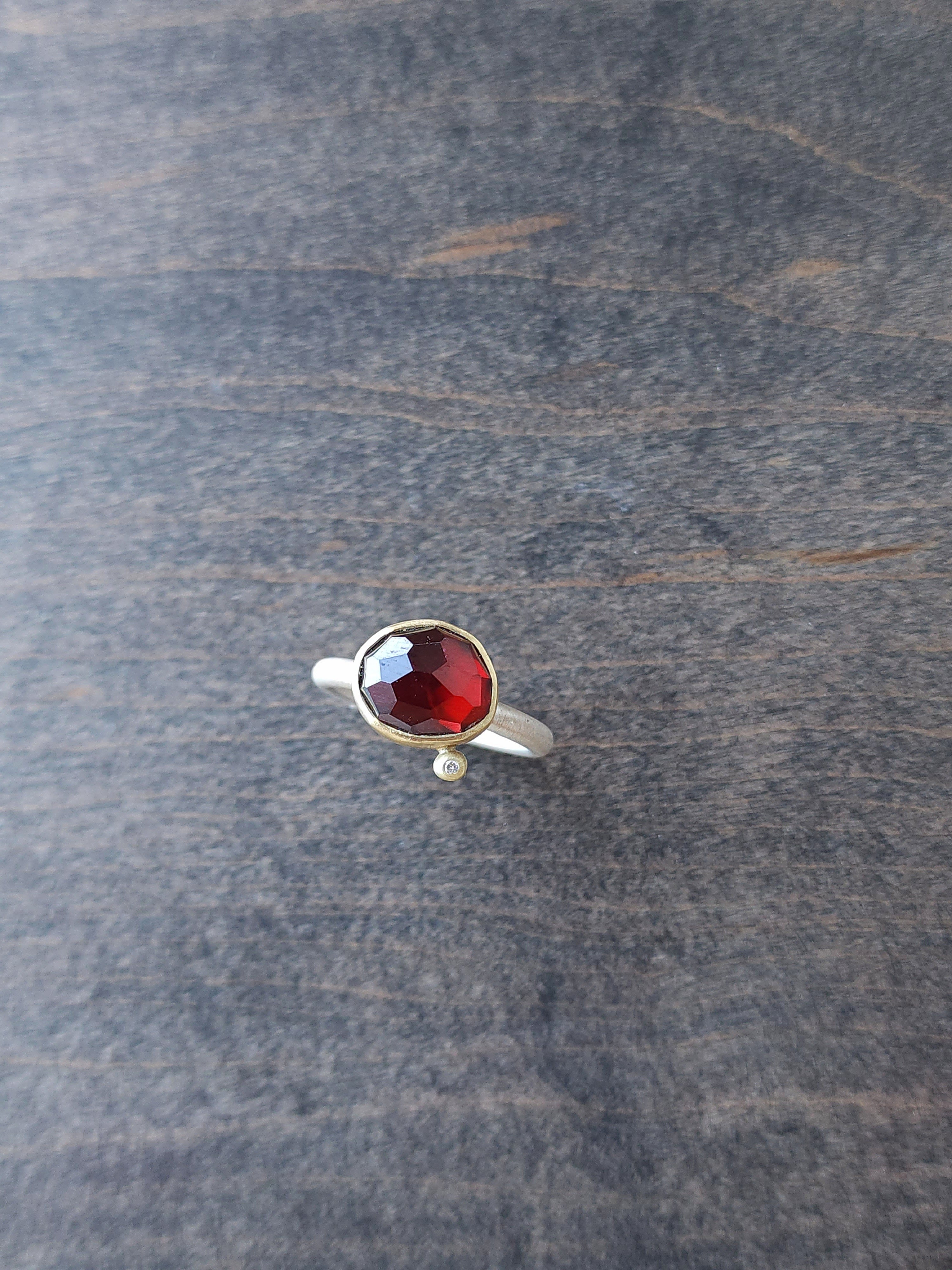 A richly colored almandine garnet with rose cut faceting is bezel set in 18k gold with a .01 tcw. diamond satellite stone in this one-of-a-kind ring. The stone is a deep red with vibrant scarlet flashes that reveal themselves as the stone moves in the light. The setting measures roughly .44"L x .44"W and sits atop a soft matte, bright sterling silver half-round band that is .0625" wide. The ring is a size 6.5, and a complimentary sizing is available on request.