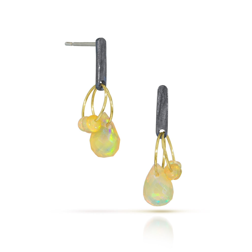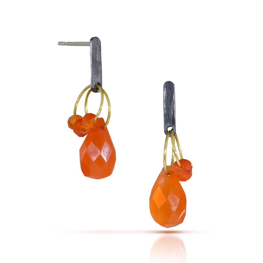 Sweetly petite earrings provide pops of color courtesy of a variety of semi-precious stone options. Two 18k gold loops suspended from an oxidized sterling silver bar with a subtle hammer texture hold a stone briolette that is accompanied by three petite stone rondelles in a complimentary color. The earrings measure approximately 1"L x .25"W.