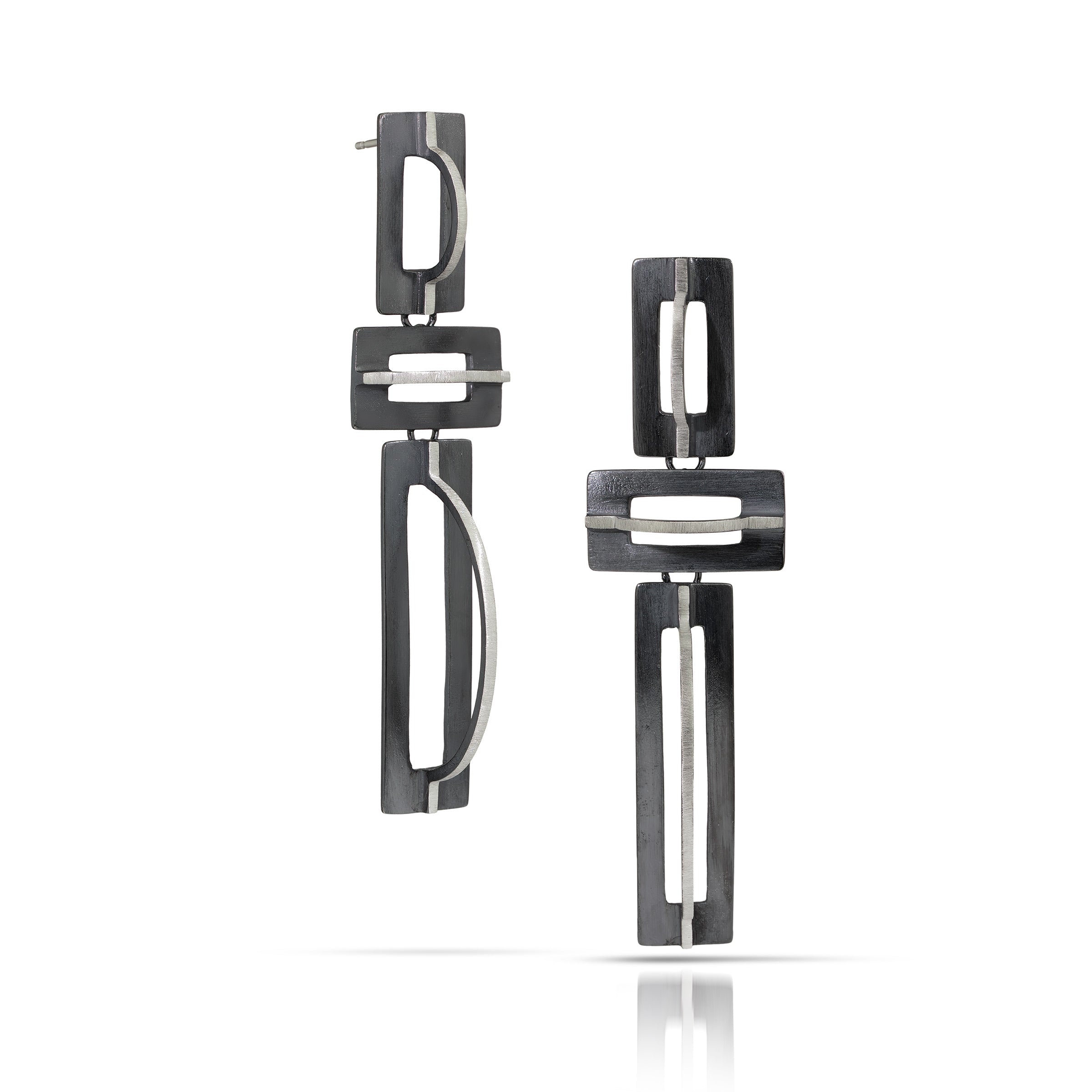 These sculptural statement earrings incorporate dimension and movement with the contrast of deeply oxidized and bright sterling silver. Slender raised arches with a hand-sanded finish span the open space of three rectangles connected by loops that allow for a gentle sway. The top shape sits comfortably against the ear in these post earrings which measure 3.13"L x .88"W.